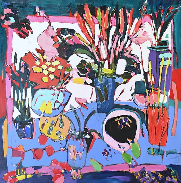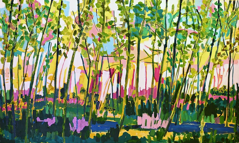 Nina Cherney is a Montreal-based artist who paints abstracted landscape and still life paintings. Whether their focus gathers beneath a tree line or atop a kitchen table, her works are less invested in resemblance than in the quality of connection—of stillness and discovery—that such vistas can produce. The pulse of morning, the humming of the trees, nature’s clever flourishing: each captures a kind of inner weather.